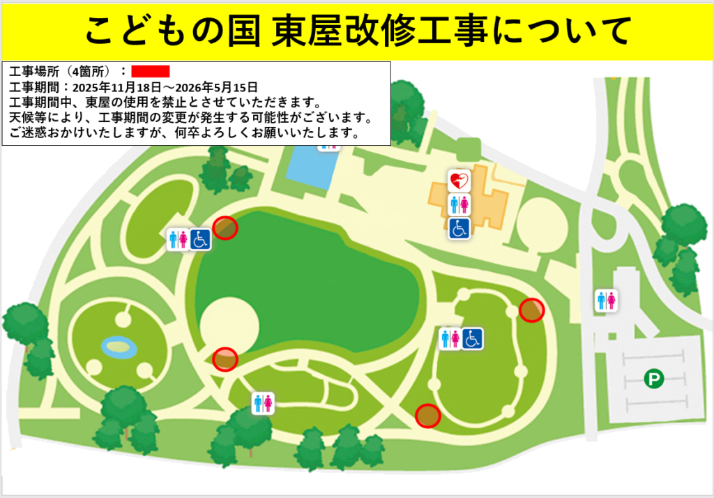 施設情報 2025年11月8日(土) 養老公園 こどもの国 東屋改修工事(11/18~)について 日頃より養老公園をご利用いただきありがとうございます。 以下の日程にて、養老公園内こどもの国の東屋改修工事を実施いたします。 工事に伴い、4か所の東屋の使用ができません。 工事期間中はご迷惑をおかけしますが、何卒ご理解とご協力を賜りますようお願い申し上げます。 こどもの国 東屋改修工事 期間:2025年11月18 日(火)~ 2026年5月15日(金) 備考:天候等により、工事期間が変更になる場合がございます。 お知らせ一覧に戻る