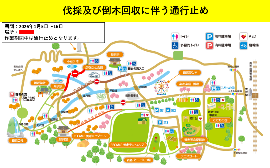 施設情報 2025年12月26日(金) 伐採・倒木回収作業(1/5~)に伴う通行規制について 日頃より養老公園をご利用いただきありがとうございます。 以下の日程にて、伐採・倒木回収作業(1/5~)を行います。 それに伴い、工事期間中は白石用水路沿いの園路が通行止めとなります。 工事期間中はご迷惑をおかけしますが、何卒ご理解とご協力を賜りますようお願い申し上げます。 伐採・倒木回収作業 期間:2026年1月5日(月)~ 1月16日(金) 備考:期間中は通行止めとなります。また、天候等により工事期間が変更になる場合がございます。 お知らせ一覧に戻る