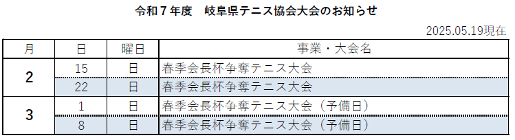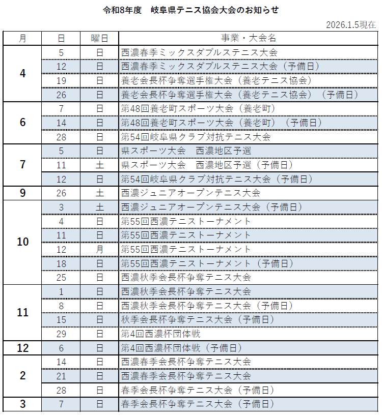 施設情報 2026年1月5日(月) 令和7年度 8年度 岐阜県テニス協会大会のお知らせ 使用時間:9時00分~17時00分 ※使用コート:全8面 ※予備日に関しましては、中止の場合解除します。 岐阜県テニス協会が運営する大会につきましては、大会を優先させていただきます。 尚、コートのご予約やお問い合わせに関しましては、養老公園事務へお問い合わせください。 TEL:0584-32-0501 養老公園テニスコートのご案内はこちら 【PDF】令和7年 岐阜県テニス協会大会のお知らせ 【PDF】令和8年 岐阜県テニス協会大会のお知らせ お知らせ一覧に戻る