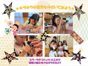 楽しく算数を理解しながら、ミラーの角度と映像の関係を学習し、万華鏡の仕組みや面白さを知っていただきます。
