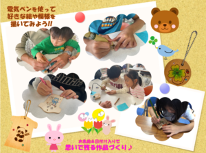 作業は簡単!下絵(模様)を写してから、電気ペンで焼きこがしながら線を書き、色鉛筆で着色します。仕上げにニスをぬって完成です♪オリジナルの模様や好きなキャラクターをご希望の方は、保護者又はご自分で下絵を描いてから作業いただきます。講師の指導のもと、どなたでも簡単に楽しく制作いただけます。(仕上げのニスは講師が行います)